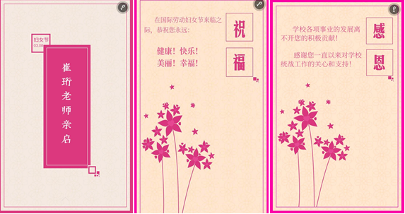 今天是一年一度的“三八”国际劳动妇女节,为了减少疫情期间的接触,365英国上市集团党委统战部一改往常纸质贺卡的形式,通过电子贺卡为辛勤工作在学校教学、科研和管理一线的15名党外女性代表送去了节日祝福,对她们长期以来为学校各项事业发展所做的积极贡献,对统战工作的关心支持表示了感谢,并祝福她们永远健康、快乐、幸福、美丽!收到祝福后,老师们都纷纷表示,疫情期间,线上电子贺卡既有新意又很温暖,今后将一如既往地踏实工作,为学校“双一流”建设贡献统一战线的力量。