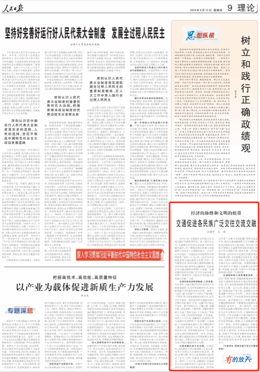 近日,《人民日报》理论版刊发了我校铸牢中华民族共同体意识研究基地专家、公共管理学院教师王浩宇、王斌署名文章《交通促进各民族广泛交往交流交融——经济的脉络和文明的纽带》。“人民网”“求是网”“光明网”“中国网”等多家权威媒体先后进行转载。