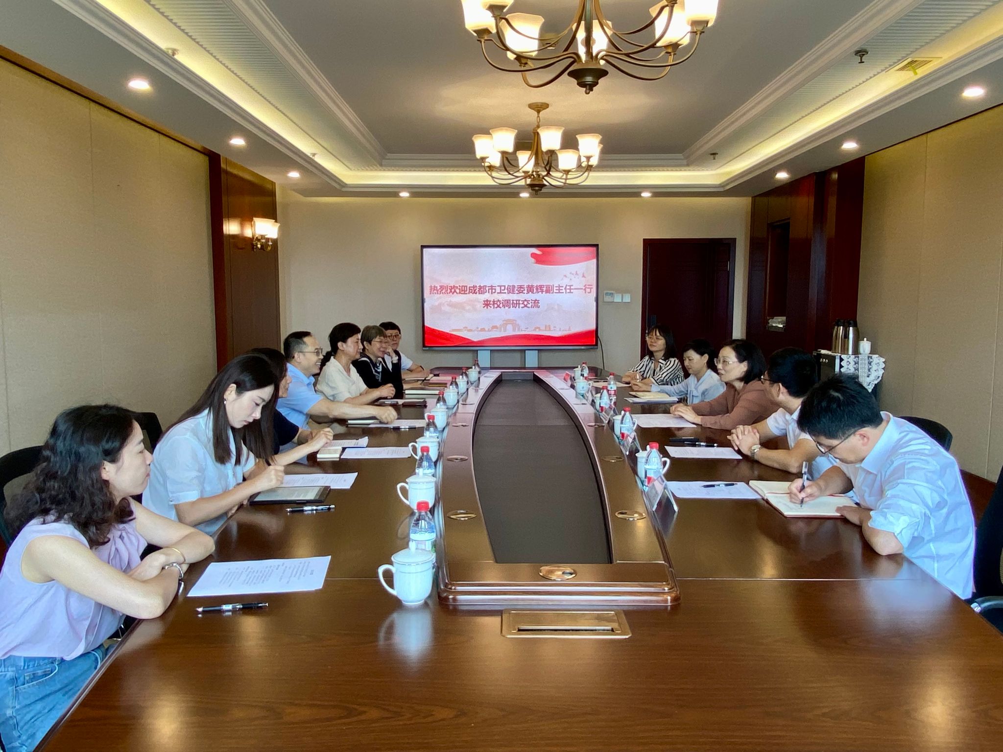 5月14日,成都市卫健委党组成员、副主任黄辉一行到我校交流调研统战工作。学校党委副书记杨爱华,党委常委、统战部部长汪铮出席调研座谈会。成都市第三人民医院副院长李暄、西部战区总医院人才办公室中校主任王松涛、通用医疗三六三医院宣传统战部部长宋燕参与调研。