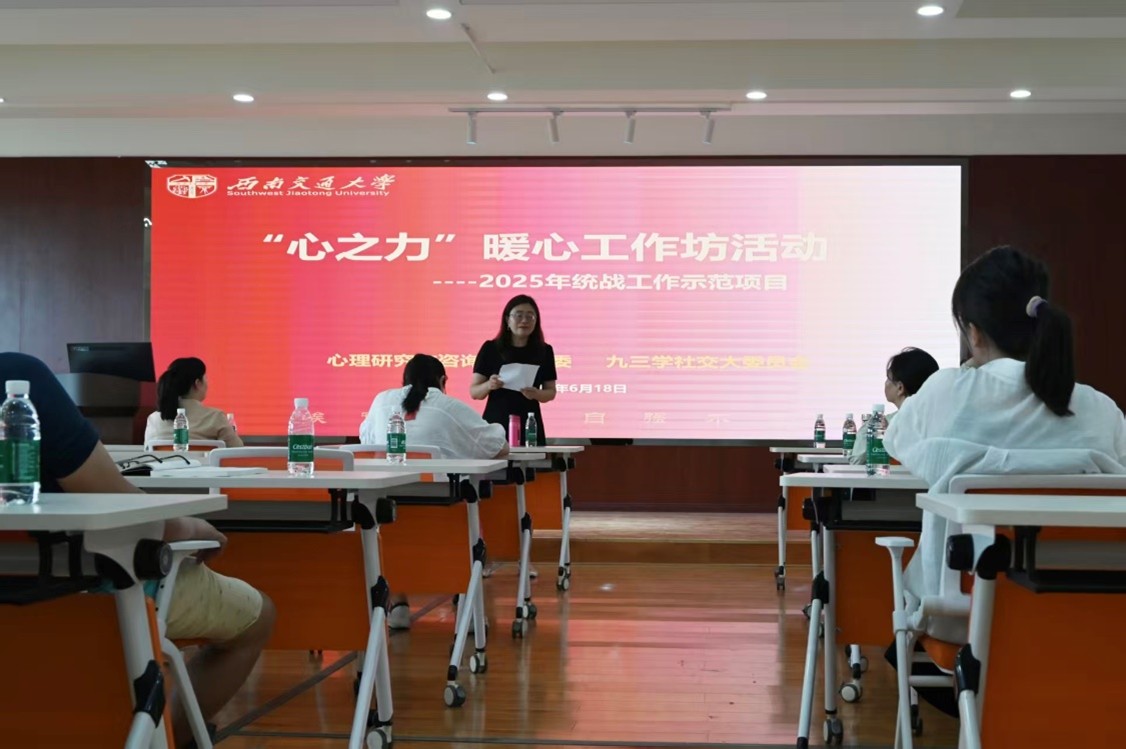 2025年6月18日下午,心理研究与咨询中心党委与九三学社西南交大委员会联合举办了“心之力”暖心工作坊。该活动作为学校“铸魂工程”统战工作特色示范项目,获得了学校统战部的大力支持,社会主义学院副院长乐佳、心理研究与咨询中心教师以及九三学社西南交大委员会会员代表参与了本次活动。活动以呵护心理健康为纽带,搭建了统战部门、教学科研机构与民主党派基层组织联动服务师生的实践桥梁,切实将统战凝聚力转化为关爱师生心理健康的实际成果。