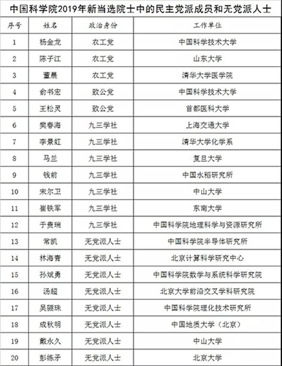 具体来看,在中国科学院增选的64位院士中,有20位是民主党派成员和无党派人士!其中,农工党3位,致公党2位,九三学社7位,无党派人士8位!他们是谁?一起来看名单——