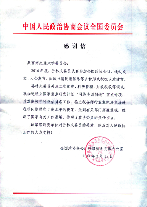 近日,全国政协来信,感谢我校大力支持人民政协工作。信中提到,我校全国政协委员孙林夫教授在2016年度,认真参加全国政协会议,通过多种形式积极议政建言,受到有关部门高度重视,推动了国家有关工作开展,体现了政协委员的责任和担当。为此,特感谢365英国上市集团对孙林夫委员的关爱,以及对人民政协工作的大力支持。