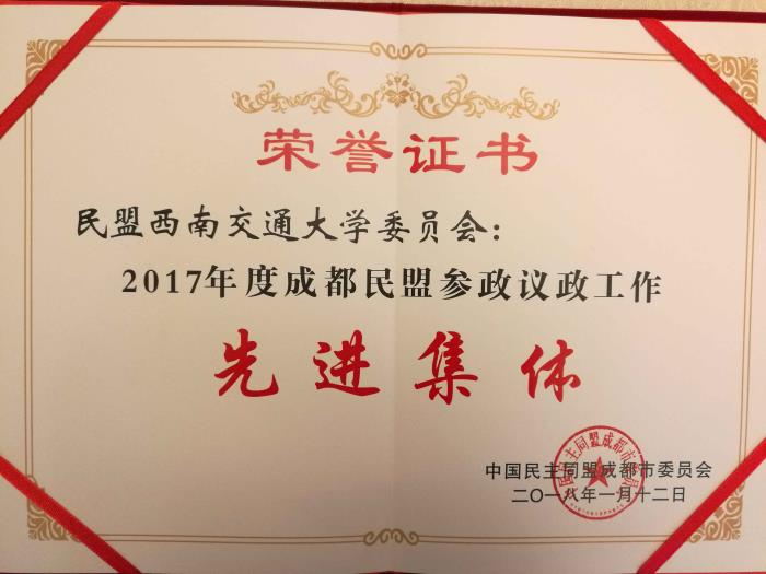 参政议政是民主党派的基本任务与职责。我校民盟界别政协委员积极履职尽责。2017年,省政协委员史本山提交《把四川建设成轨道交通产业新高地的建议》和《改革发展区管理体制,促进我省开发区转型创新发展的建议》提案2件。市政协常委曾京提交《关于加快成都市域铁路建设的建议》提案,完成民盟市委重点课题《完善高校科技成果转化激励机制》,提案《关于在十三五规划中进一步发挥好高铁产业在“一带一路”互通互联中的龙头引领作用的建议》被中央统战部采用,获评“2017年度民盟四川省委社情民意工作先进个人”。高增安委员提交省政协提案1件(《关于扎实推进四川自贸试验区建设的建议》)、市政协提案3件(《关于为成都国家中心城,市建设营造良好舆情环境的建议》《关于构建高校实验室危险废弃物处置长效机制的建议》《关于恢复成都地铁6号线“交大犀浦校区站”命名的建议》)、市政协社情民意信息3条,参与民盟市委自贸区建设调研课题并赴成都青白江区、高新区、双流区、天府新区以及上海、重庆、厦门、深圳自贸区实地考察调研,《建议在“一带一路”倡议中加快中国高铁“走出去”步伐》被中央统战部采用,被省委统战部、人社厅等7部门联合授予”四川同心·服务团活动先进个人“称号。