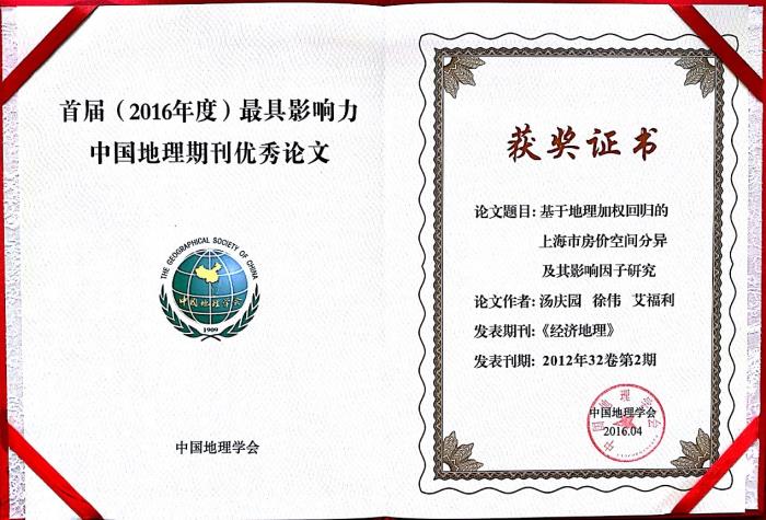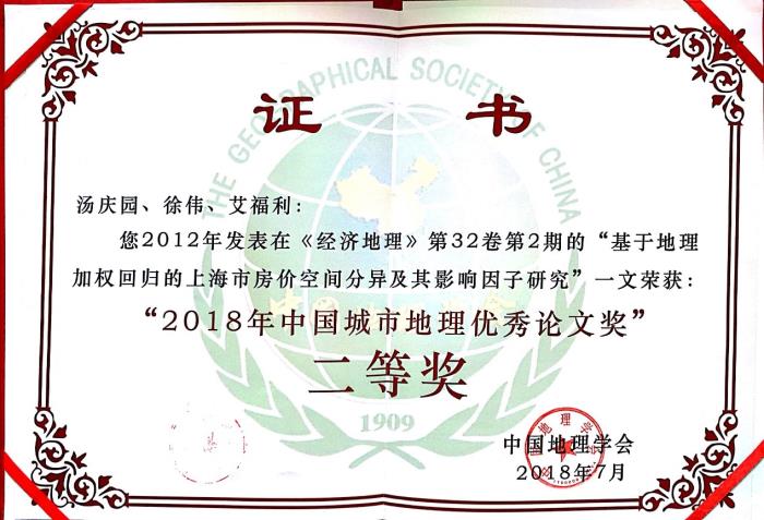 汤庆园博士以第一作者身份发表在2012年《经济地理》上的论文《基于地理加权回归的上海市房价空间分异及其影响因子研究》获选,该论文在2016年就曾经获得过“首届(2016年度)最具影响力中国地理期刊优秀论文”,还先后被中国人民大学书报资料中心、国务院发展研究中心信息网(国研网)和中国社科院主办的中国社会科学网等影响力较大网站的全文转载。这篇论文主要是利用上海市外环以内2010年12月1014个小区的平均房价数据,通过构建地理加权回归模型,并与基于全局最小二乘法(OLS)进行比较,揭示上海小区房价的空间分异和不同影响因子的影响。研究发现,每增加或减少一个单位各影响因子对房价的影响大小依次为:建成时间,到CBD距离,绿化率,到公园距离,距地铁站距离,距超市距离和距学校距离。