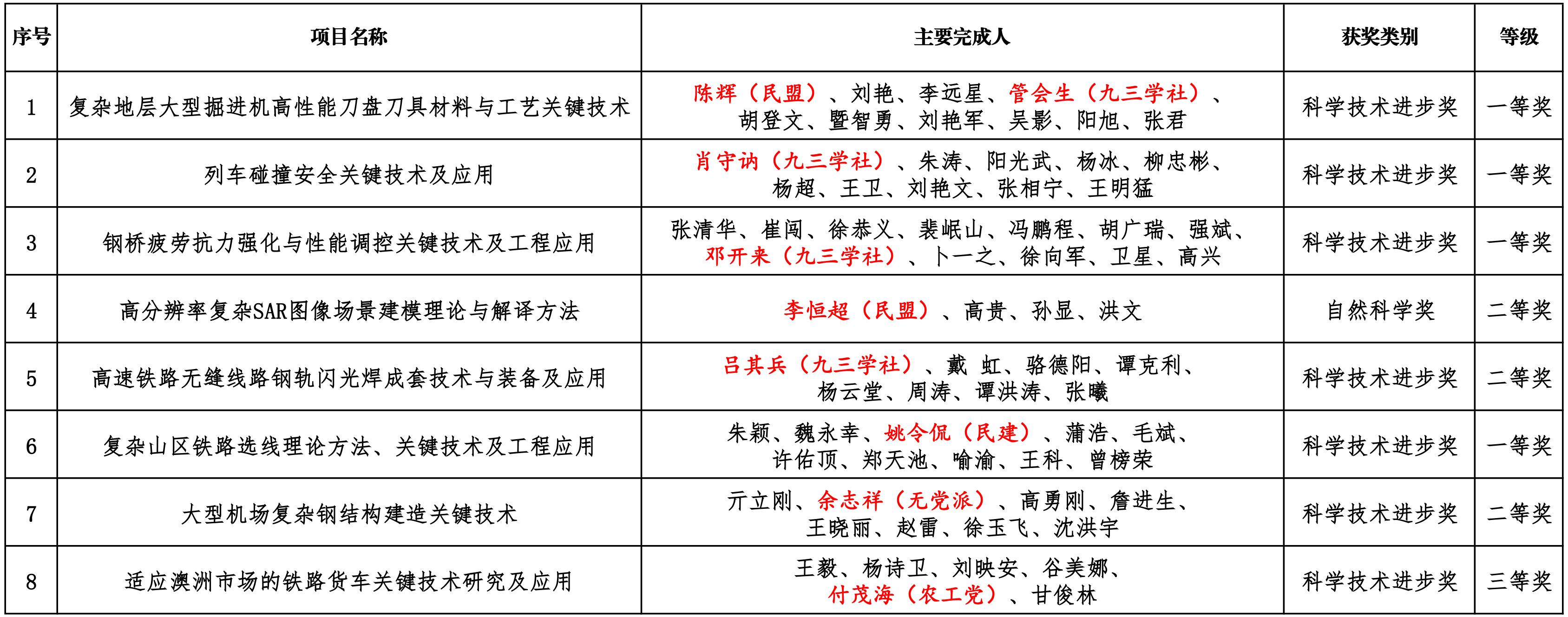 民盟交大委员会副主委、材料科学与工程学院学院陈辉教授主持的“复杂地层大型掘进机高性能刀盘刀具材料与工艺关键技术”,九三学社社员、牵引动力国家重点实验室肖守讷研究员主持的“列车碰撞安全关键技术及应用”获科技进步一等奖,民盟交大委员会副主委、期刊社主任李恒超教授主持的“高分辨率复杂SAR图像场景建模理论与解译方法”获自然科学二等奖,九三学社社员、材料科学与工程学院吕其兵教授主持的“高速铁路无缝线路钢轨闪光焊成套技术与装备及应用”获科技进步二等奖。