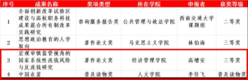近日,教育部第八届高等学校科学研究优秀成果奖(人文社会科学)评选结果公布,学校共4项成果获奖。其中,四川省人大常委会委员、民盟四川省委副主委、西南交大委员会主委,经济管理学院高增安教授,九三学社社员、人文学院李任飞教授申报的成果分获著作论文类三等奖和普及读物奖。