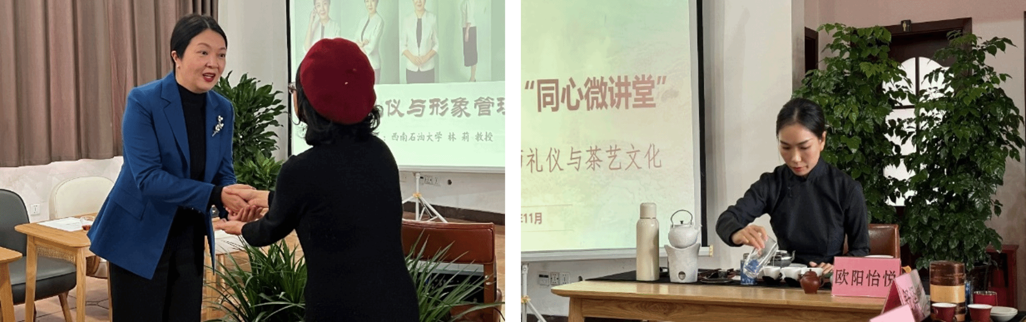 活动邀请西南石油大学马克思主义学院林莉教授作“公务礼仪与形象管理”的专题分享。林莉从日常礼仪、形象礼仪、会议礼仪等方面对公务礼仪进行了详细讲解,并通过互动形式展示了形象管理与仪态的重要性,强调了形象管理的“TSOR”原则,分享了教师关于服饰、站姿、行姿等方面的经验。此外,活动还邀请茶艺专家欧阳怡悦分享了茶艺文化,现场带领大家观茶色、闻茶香、品茶味、悟茶韵,展示中华茶礼仪,让大家切身感悟茶文化的独特魅力。
