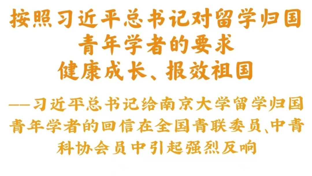 中共中央总书记、国家主席、中央军委主席习近平5月18日给南京大学的留学归国青年学者回信,对他们寄予殷切期望。回信在全国青联委员和中国青年科技工作者协会会员中引起热烈反响,特别是具有海外留学归国经历的全国青联委员、中青科协会员纷纷表示,要心怀“国之大者”,深切体悟习近平总书记的重视关怀,以高度的政治自觉学习好宣传好贯彻好回信精神,大力弘扬老一辈科学家留学报国的光荣传统,以报效国家、服务人民为自觉追求,围绕党和国家中心工作,坚持立德树人,坚定文化自信,为全面建设社会主义现代化国家、实现中华民族伟大复兴的中国梦积极贡献智慧和力量。