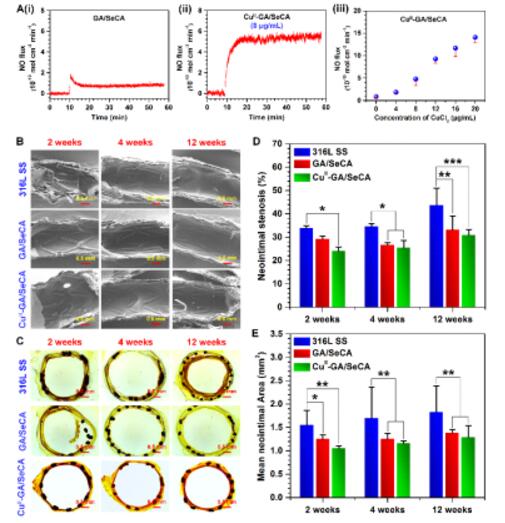 图2. (A)支架实现了一氧化氮理疗气体的精准、可控、按需催化释放(B-E)经工艺优化的一氧化氮理疗气体催化涂层应用于血管支架表面改性,实现了2周内快速内皮化,有效地抑制了内膜增生,显著地降低了支架再狭窄率。