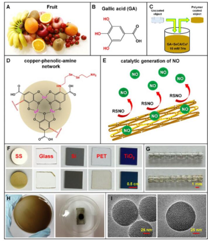 基于此,黄楠教授、杨志禄副教授团队通过与与韩国科学技术研究所Haeshin Lee教授及香港理工大学赵昕助理教授合作,结合贻贝/植物灵感多酚化学和血液中谷胱甘肽过氧化物酶(GPx)的一氧化氮(NO)催化化学原理,发展出系列基于儿茶酚胺和金属-植物多酚/儿茶酚框架的理疗一氧化氮气体催化涂层表面改性技术。研究选取贻贝灵感粘附儿茶酚多巴分子、植物灵感多酚-没食子酸分子,以及具有类GPx催化活性的硒代胱胺(SeCA)及金属铜离子(Cu2+)为理疗气体催化涂层制备前驱体,基于分子/离子共组装反应原理,通过简单的“一步法”,研究者成功地构建出具有长期、持续、稳定、可精确调控NO催化释放功能的粘附涂层。该方法不需要昂贵的化学试剂及仪器设备、有毒的化学试剂、复杂的表面处理,在将来实现产业化生产中占有得天独厚的优势。该理疗气体催化涂层能够应用于包括金属、聚合物、无机材料、以及具有复杂几何形状的冠脉血管支架和纳米粒子表面改性,显示出在血液接触类材料/器械表面改性中的广谱应用价值。